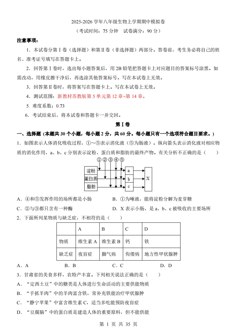 首页期中考试八年级上册生物【苏教】8上生物期中卷【第12-14章】