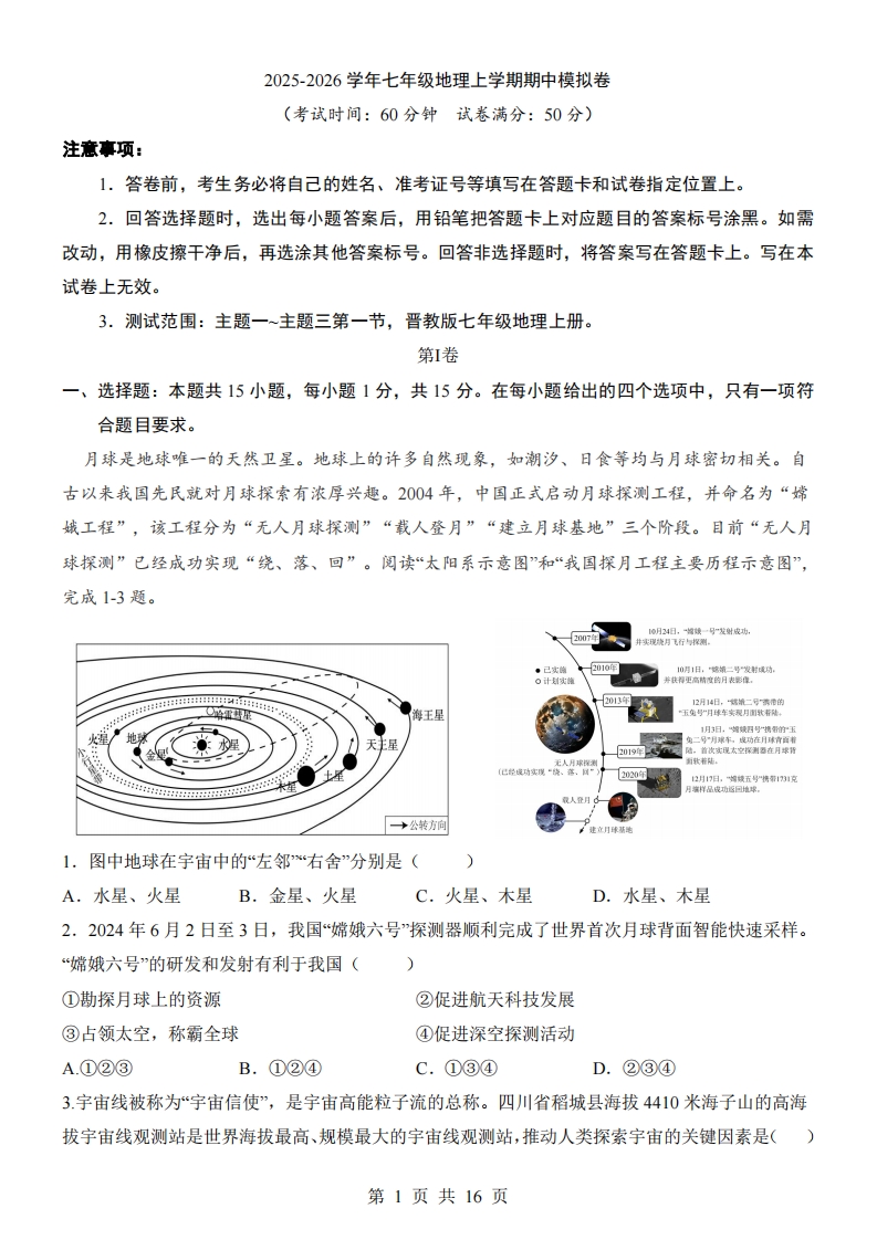 【晋教】7上地理期中卷【主题1-3.1】