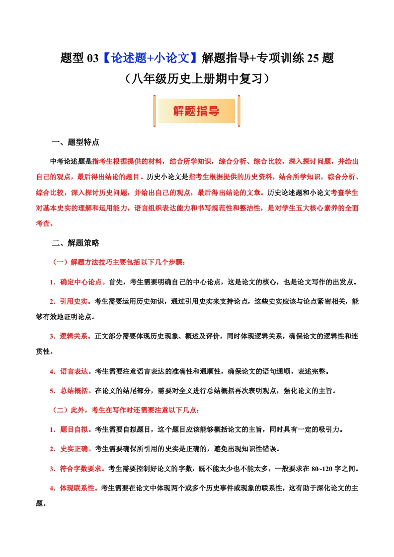 首页期中复习专题八年级历史题型03 论述题+小论文解题指导+专项训练25题(期中专项训练)(教师版)
