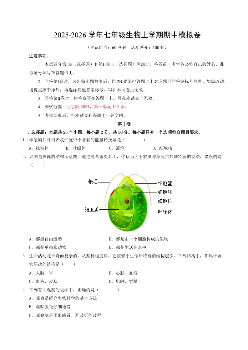 首页7年级上册生物【北京版】期中试卷七年级生物上学期期中模拟卷【测试范围:北京版2024,1-2单元第一章第2节】(考试版A4)(新教材北京版)
