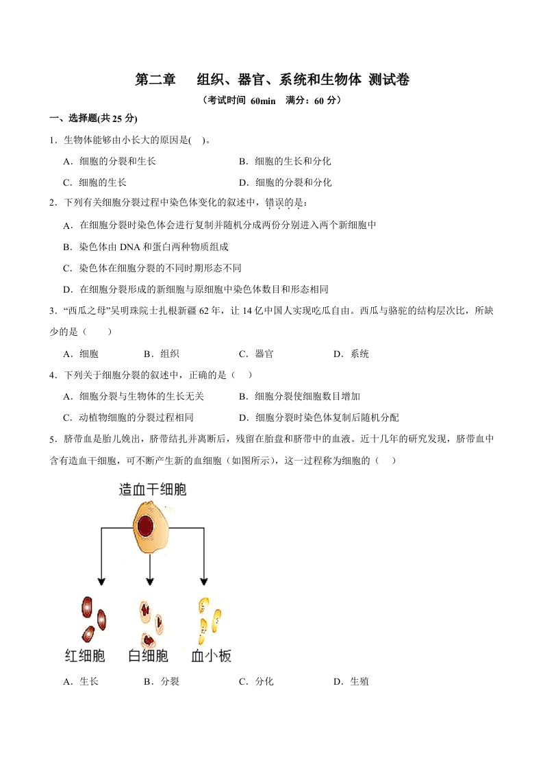 第二章 组织、器官、系统和生物体【单元卷·测试卷】(原卷版)-七年级生物上册(冀少版2024)