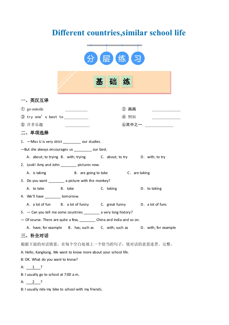 Unit 2 Different countries,similar school life(分层练习)(原卷版)