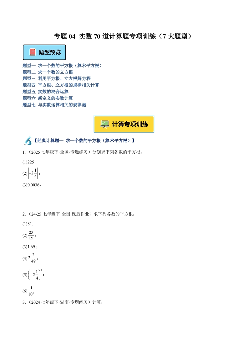 专题04 实数70道计算题专项训练(7大题型)-(湘教版2024)(学生版)