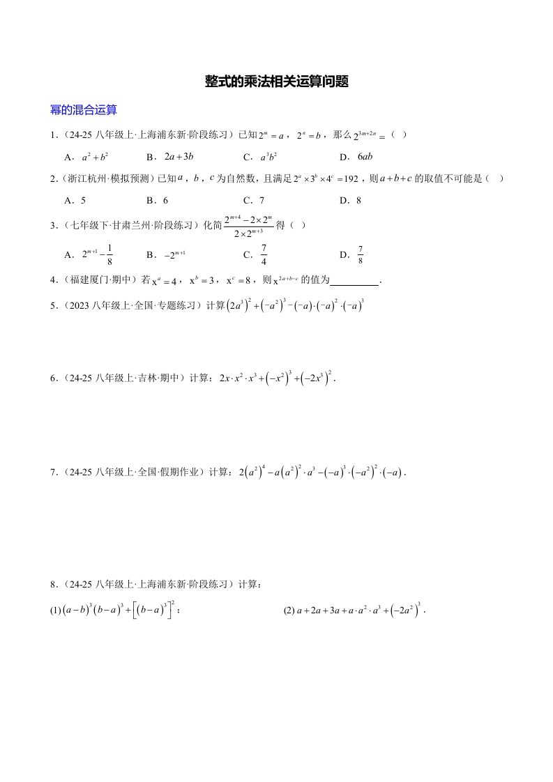 第一章 专题训练 整式的乘法相关运算精练(原卷版)