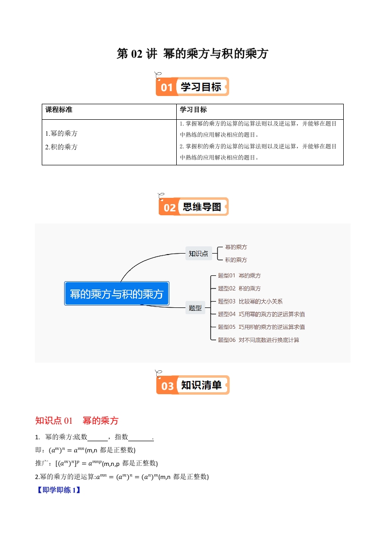 第02讲 幂的乘方与积的乘方(2大知识点+6大题型精讲+强化训练)(原卷版)-2024-2025学年七年级数学下册同步学与练(湘教版2024)