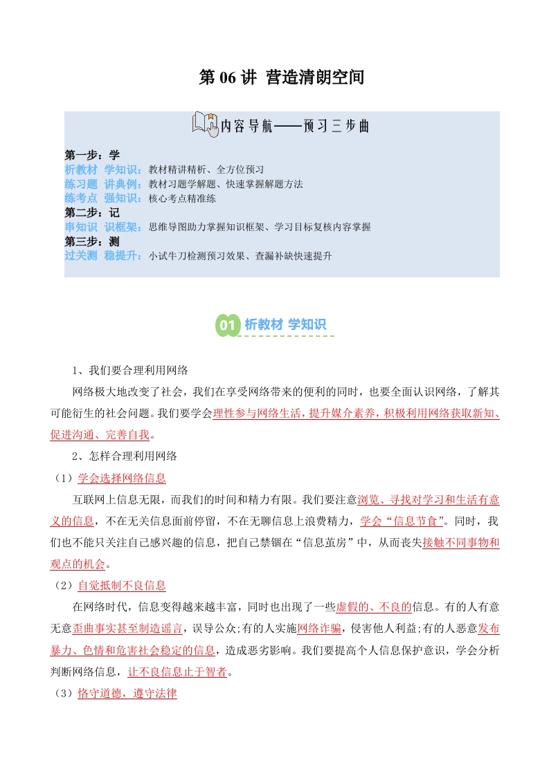 首页8年级上册道法暑假预习第06讲 营造清朗空间(解析版)-新八年级道德与法治暑假提升精品讲义(统编版2024)