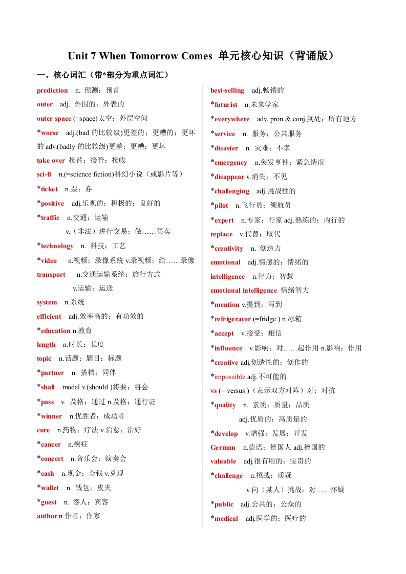 Unit 7 When Tomorrow Comes (单元核心知识)(背诵版)