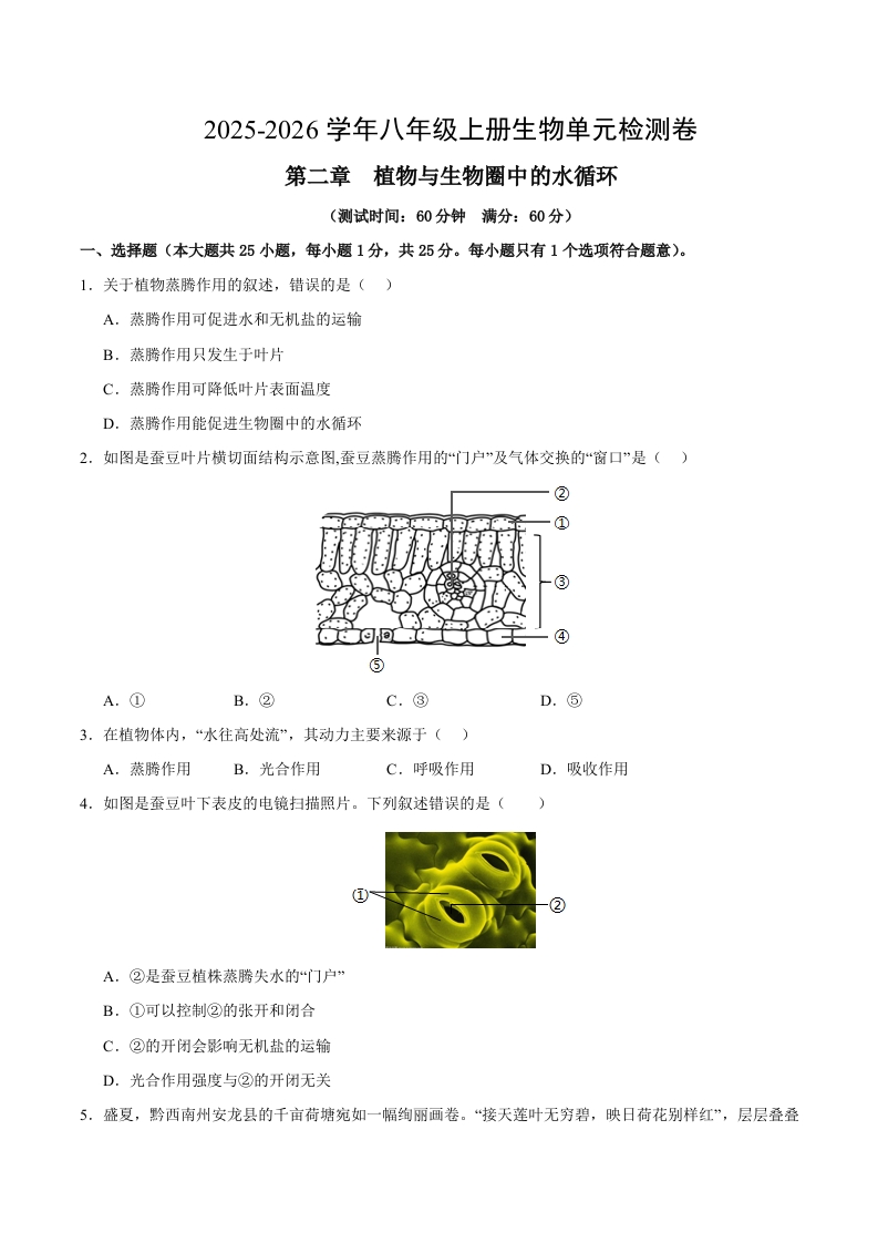 第五单元第二章 植物与生物圈中的水循环(考试版A4)