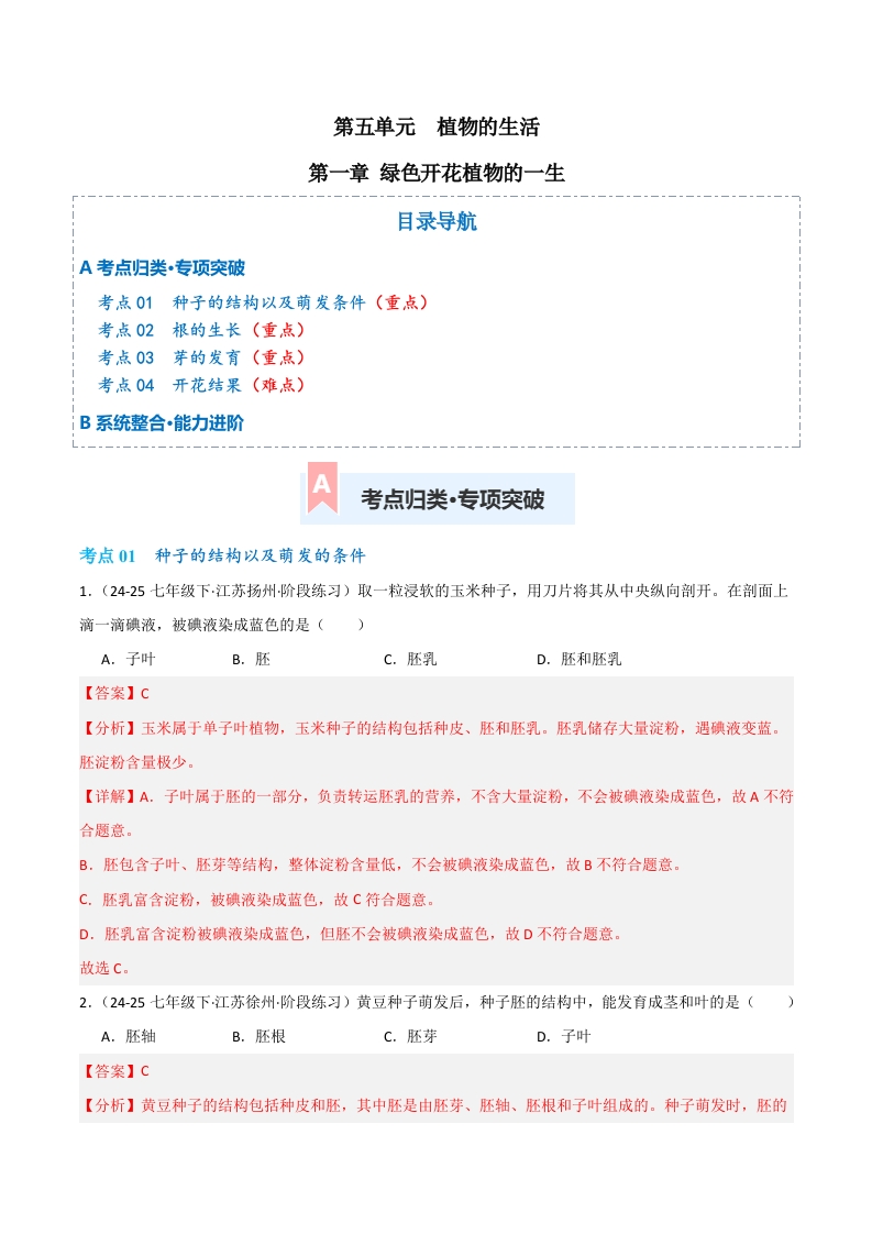 第五单元第一章 绿色开花植物的一生(专项训练)(解析版)