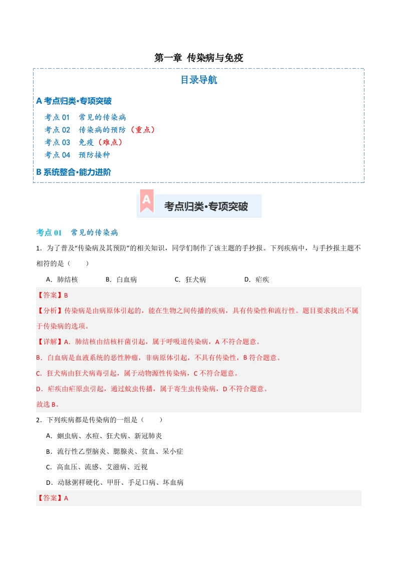 第四单元第一章 传染病与免疫(专项训练)(解析版)